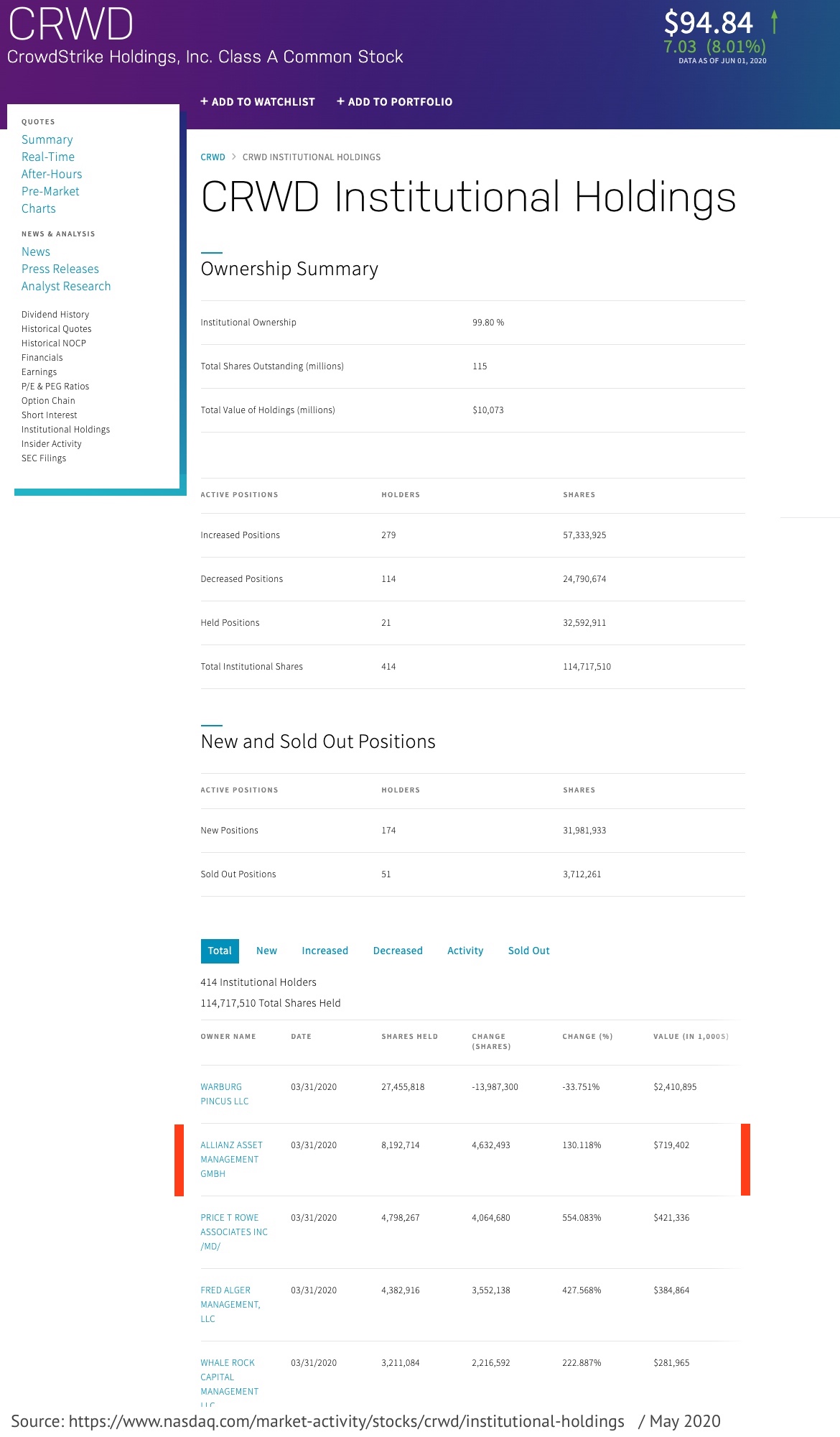 Die derzeit drei größten Aktieninhaber von Crowdstrike sind zwei große Silicon Valley Investment-Unternehmen und - komischer Weise - die in München basierte Allianz Asset Management GmbH. Crowdstrikes Markt-Kapitalisierung liegt derzeit bei 15 Milliarden USD bei etwas mehr als 2000 Angestellten, das Unternehmen hat keine Schulden und besaß im Oktober 2019 über