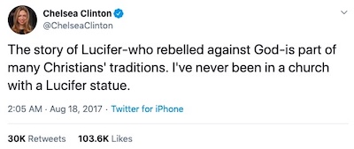 Auch Chelsea Clinton, Tochter von Bill und Hillary Clinton, wurde wenig später zu einem ausdrücklichen Bewunderer von Mephisto und scheint sich von ihm zugeflüstert zu haben, dass die Kirche ihn und ganz besonders seinem größeren Bruder Luzifer endlich entsprechend huldigen und diesem einen würdigenden Platz in jeder Kirche freimachen soll. Denn Chelsea Clinton
