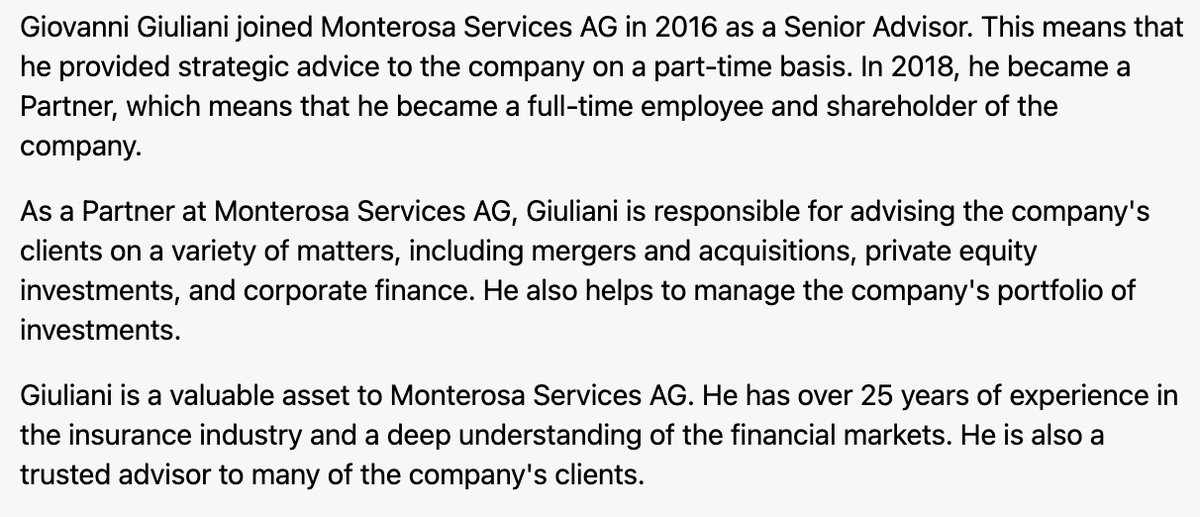 Guiliani was/is a Senior Advisor and partner of Monterosa Group's subsidiary 'Monterosa Services AG' since 2016.