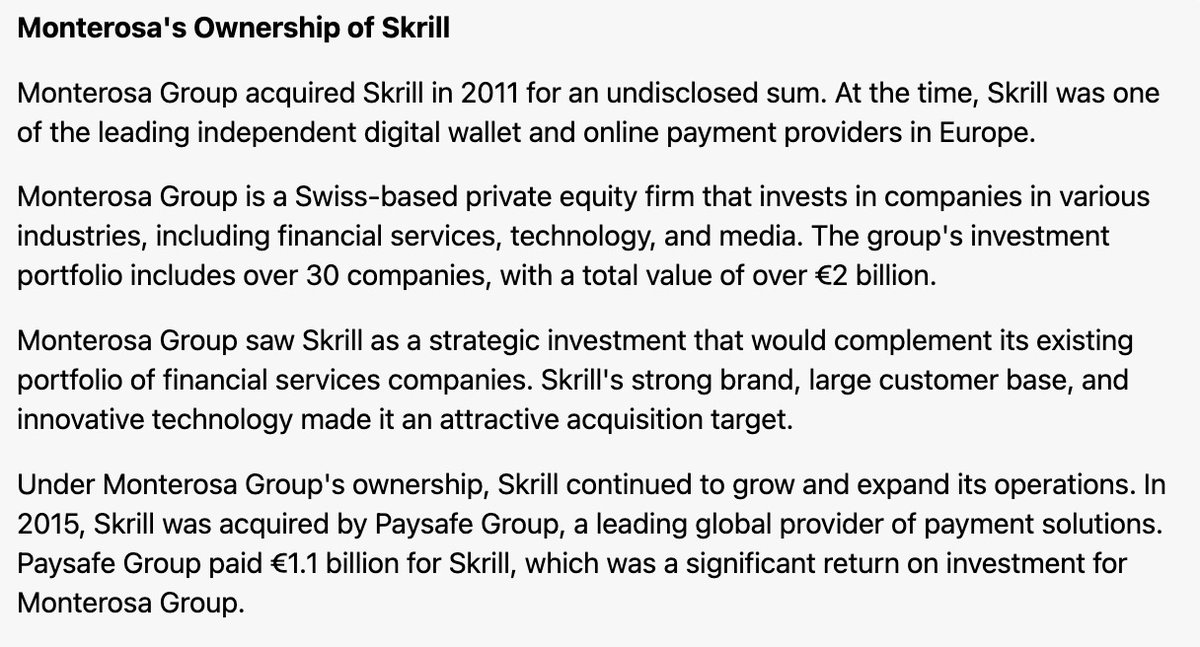 Monterosa Group allegedly - I need to verify this of course first - also acquired online payment service provider Skrill in 2011. It was sold in 2015 to PaySafe Group for allegedly 1.1 billion Euros.