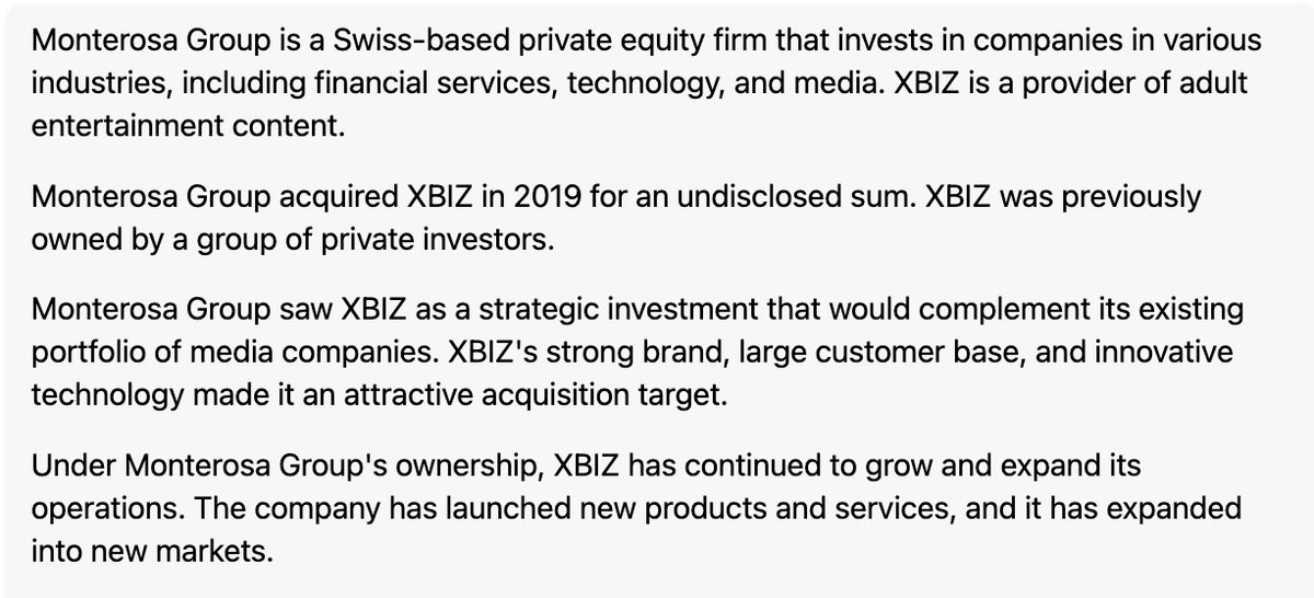 Galanis' XBIZ was also in the hands of Monterosa Group, allegedly for 2 years.