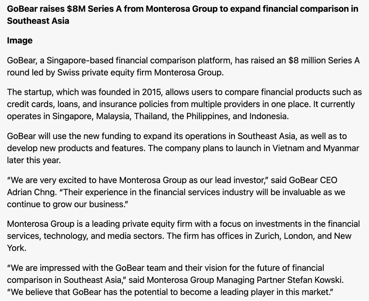 Lo and behold, Monterosa Group was an early investor into GoBear. The stake was sold in 2019 to Zurich Insurance Group.