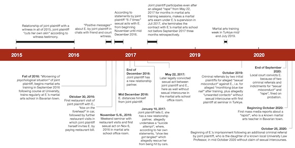 Six months later, the court proceedings begin, another four months later E. is convicted a second time, officially for having 'raped' his former martial arts student at a sexual encounter on May 22, 2017, more than 3 years earlier. The 90 pages sentencing memoranda is full of contradictions and partly scandalous justifications. The joint plaintiff had herself paid for restaurant visits during '5 to 7 times' sexual contacts with E. from beginning November until mid December 2016, which is when E. had distanced himself from her.