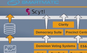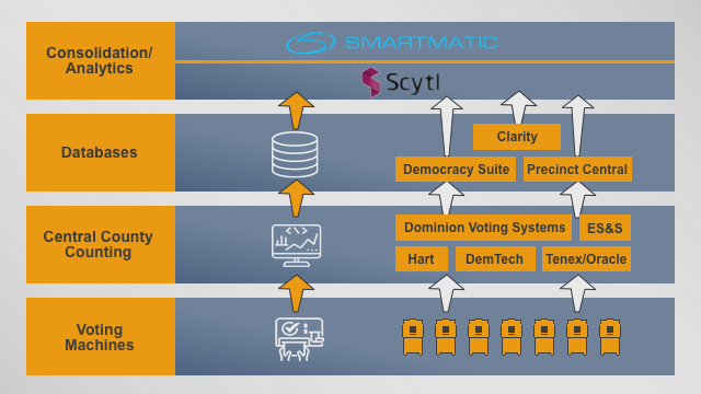 Most US state counties use voting machines to count the millions of ballots and utilize a few important software systems to gather the electronic results submitted by these machines. The most widely used software utilized by the vast majority of US counties are either Dominion Voting Systems, Tenex, ES&S, Hart or DemTech. Once having received county ballots, the various software systems forward the voting counts and information to a handful of databases, run on Amazon's cloud IT infrastructure AWS and named Clarity, Democracy Suite, Precinct Central. While Clarity database is entirely owned by Scytl, the others are either operated or at least accessible by the Spanish company.