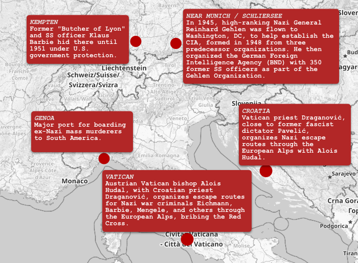 As early as around 1950, there was an explicit Catholic Nazi help underway via a Croatian priest named Draganovic, who used his Vatican connections to ensure that Klaus Barbie was literally transported under the European Alps to the Italian port town Genoa via a secret transport route for onward shipment to South America. Draganovic's contact in the Vatican was the Austrian anti-Semite and Bishop of Graz of the Vatican Collegium Teutonicum