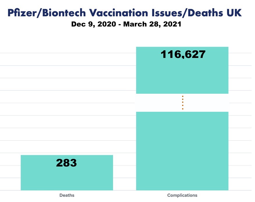 A series of studies record how many people had either died from a Pfizer/Biontech vaccination, or had developed complications. For example in the UK, where