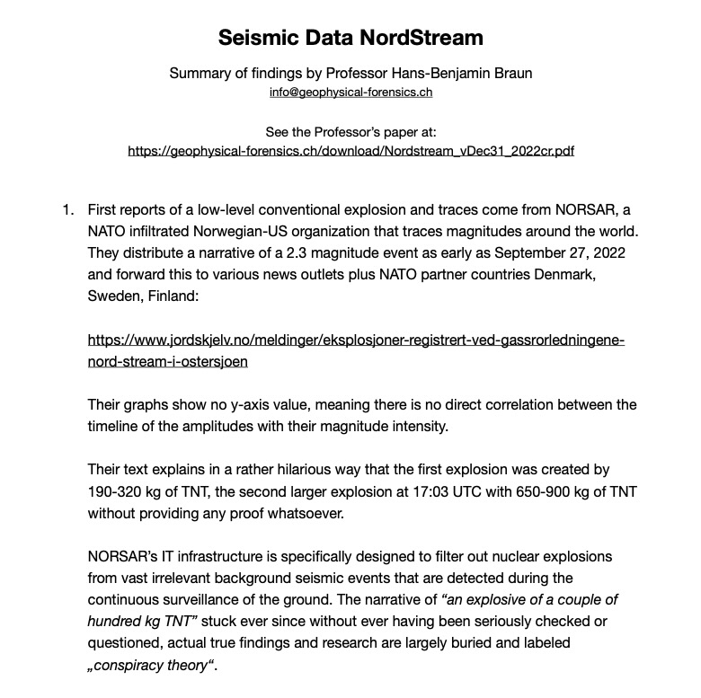 independent scientific investigation of the explosion amplitudes and more. Dr. Hans Benjamin Braun, until recently a professor of physics from Switzerland with more than 120 scientific publications, including in Nature, his work having been cited over 3600 times, came up with a number of revelations concerning the NordStream pipeline explosions that are almost too bombastic to believe.