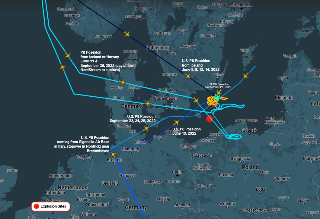 On September 26, 2022, the day of the pipeline explosions, another unknown P8 Poseidon aircraft, most likely from Iceland or northern Norway, circled the second explosion site northeast of Bornholm a few hours after the first NordStream explosion was recorded southeast of Bornholm at about 2 am. Coming from the north, this P8 first flew to Poland for in-flight refueling before circling rather suspiciously at about 4 am over the second explosion site northeast of Bornholm which exploded many hours later. It continued east somehow along the pipeline route before returning to Norway or Iceland. The plane's transponder was also turned off, additional identification tags were encrypted to conceal its identity.