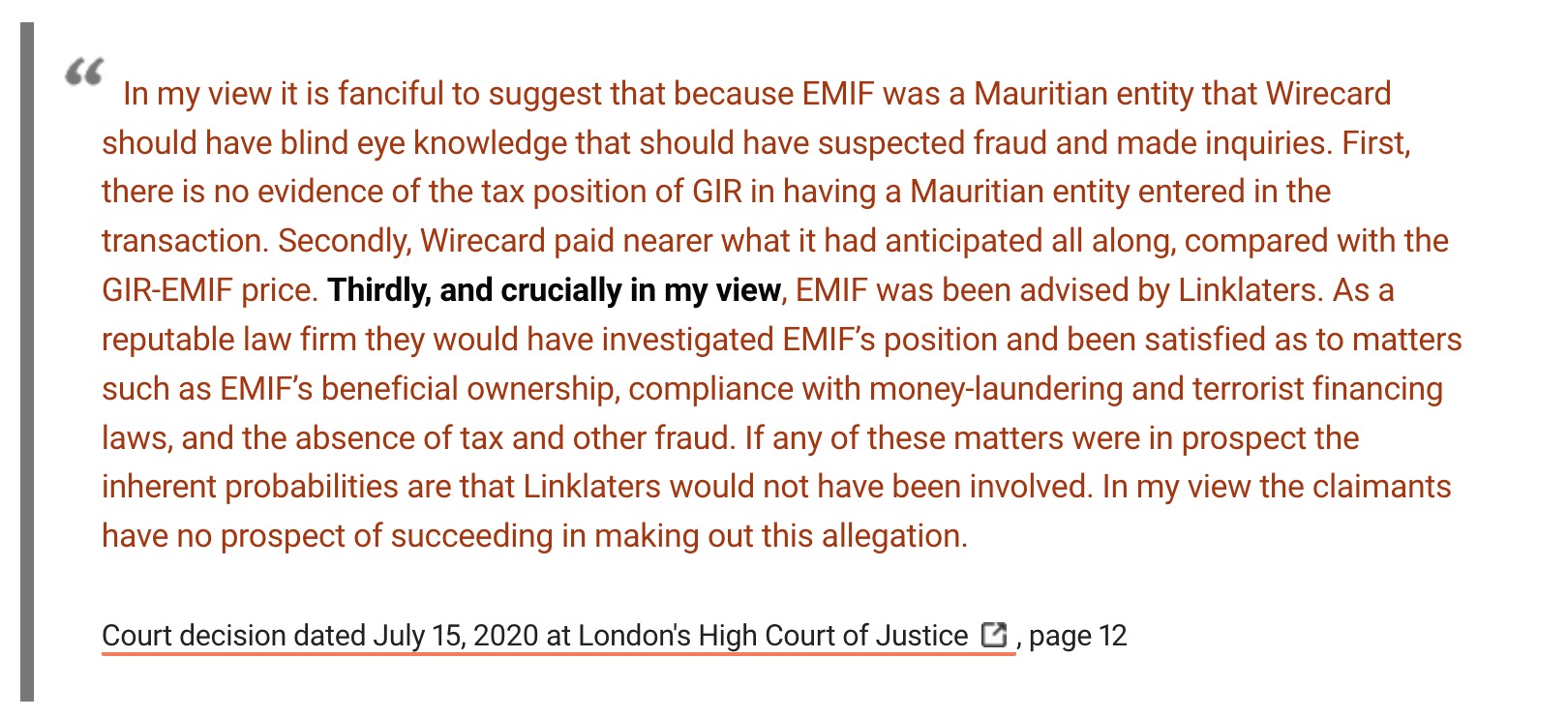 This may be due to the fact that in the above-mentioned London court case of July 2020, a few weeks after the #Wirecard insolvency, Judge Sir Ross Cranston also stated that the ominous fund EMIF from Mauritius was advised by Linklaters lawyers FROM MOSCOW !