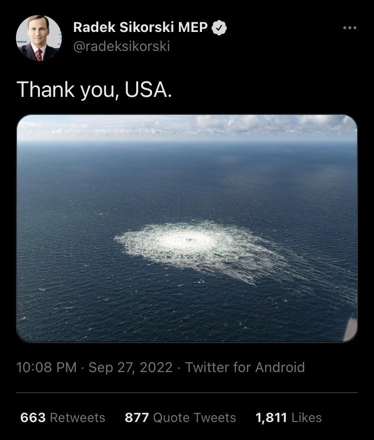 Twitter message "Thank you, USA" by Polish MEP Sikorski