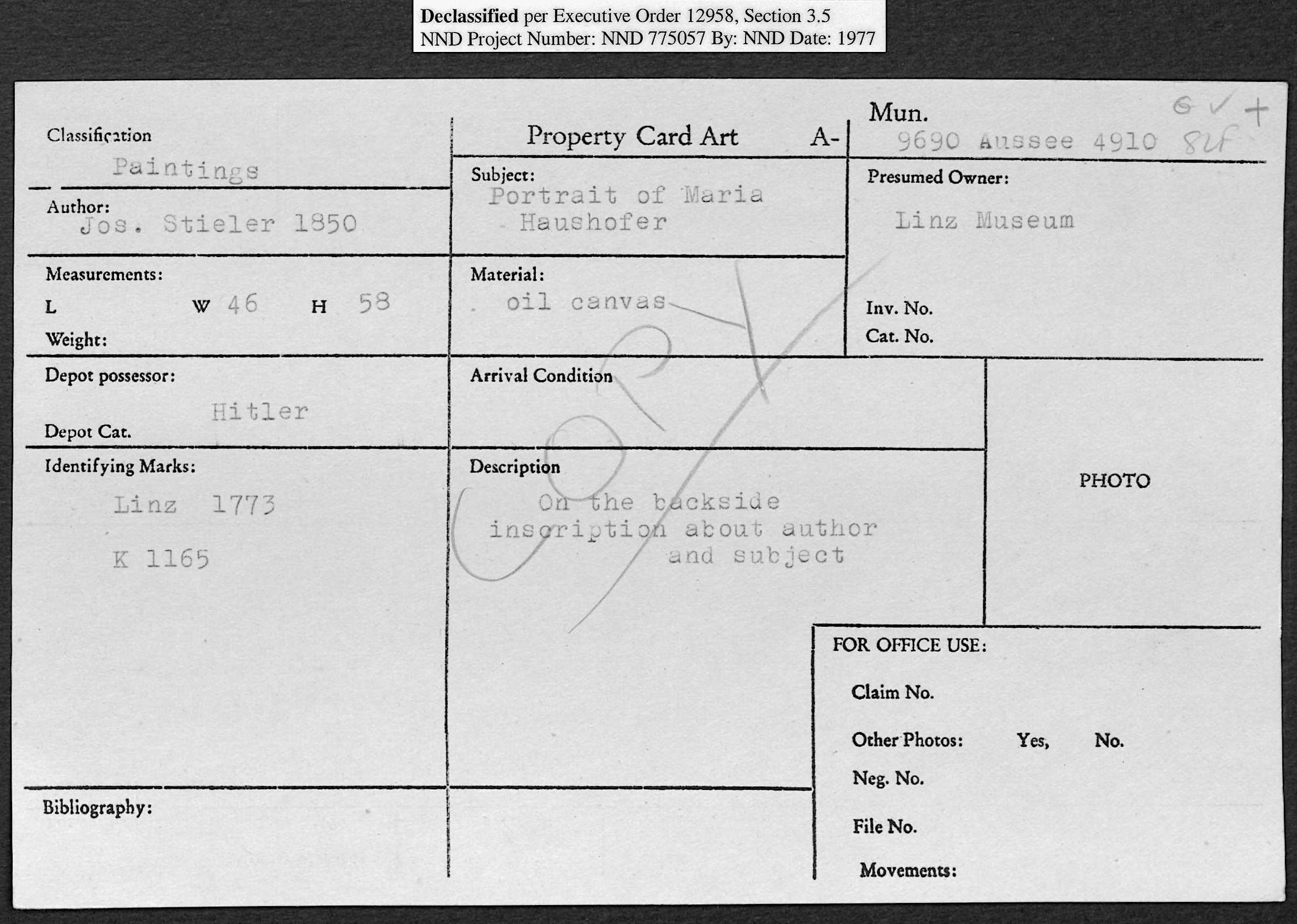 Property Card, 1945: portrait of Karl Haushofers sister and famous painter Maria is registered property of 'Hitler'